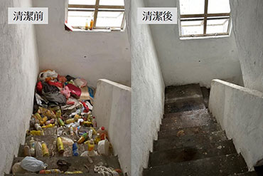 油尖旺民政事务处透过地区主导行动计划,委托承办商为区内三无大厦公用部分进行清洁工作。图示天台和后楼梯清洁前和清洁后的情况。