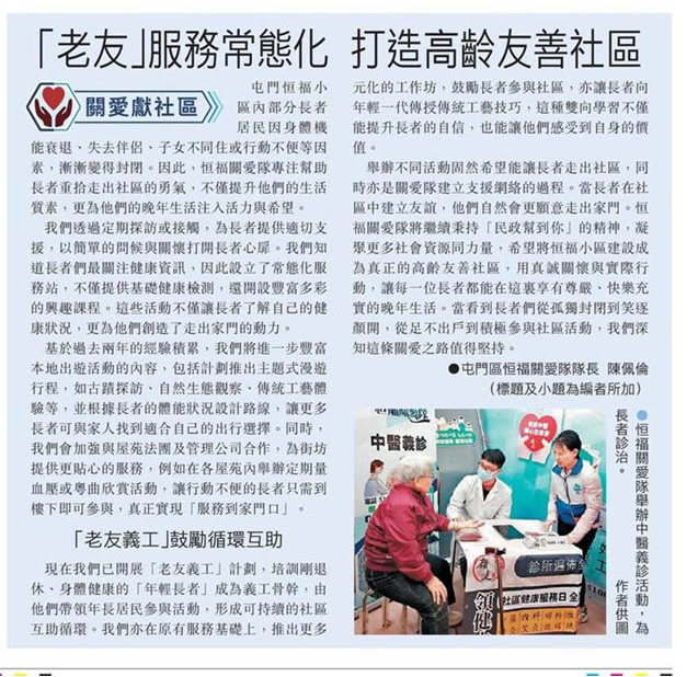 全方位关顾 助老友记「原区安老」(文汇报 A14版)
