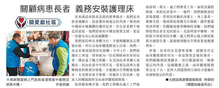 关顾病患长者 义务安装护理床 (文汇报 A10版)